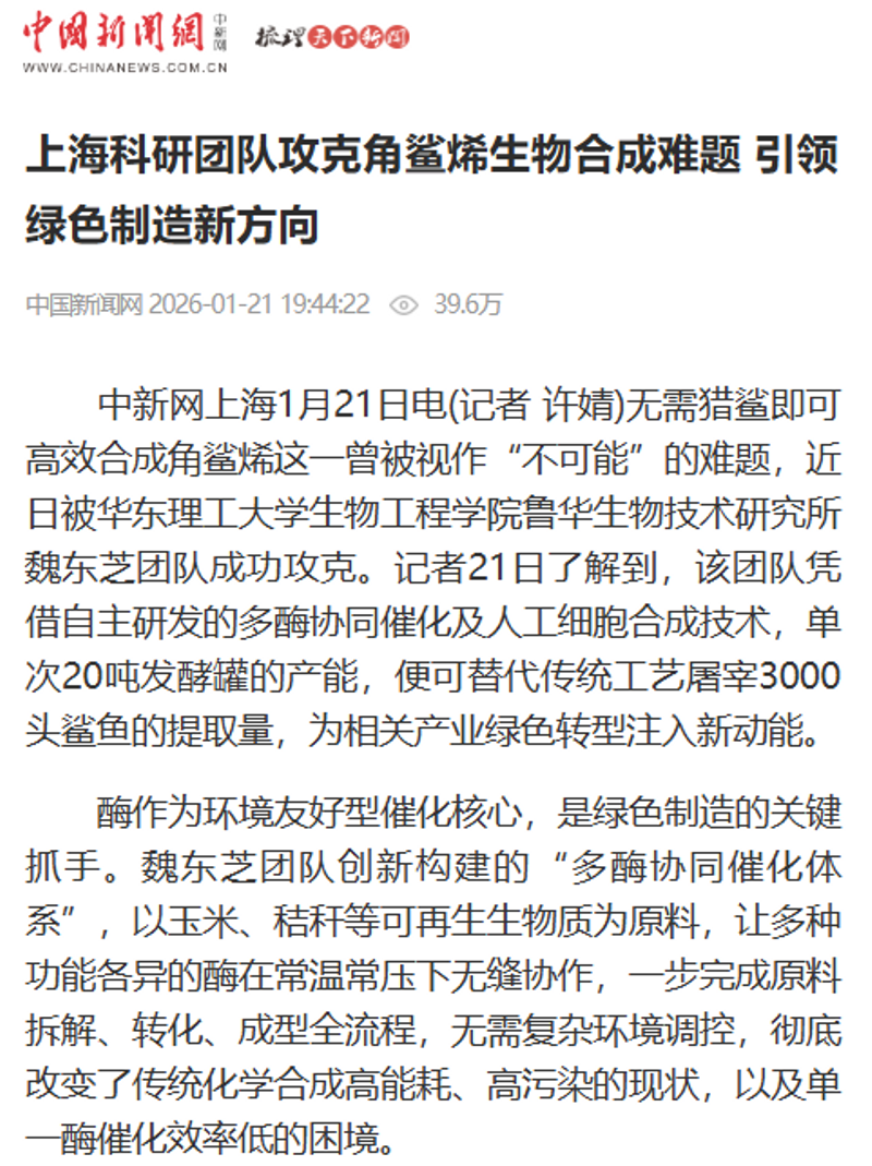 中新网上海1月21日电(记者 许婧)无需猎鲨即可高效合成角鲨烯这一曾被视作“不可能”的难题,近日被华东理工大学生物工程学院鲁华生物技术研究所魏东芝团队成功攻克。记者21日了解到,该团队凭借自主研发的多酶协同催化及人工细胞合成技术,单次20吨发酵罐的产能,便可替代传统工艺屠宰3000头鲨鱼的提取量,为相关产业绿色转型注入新动能。