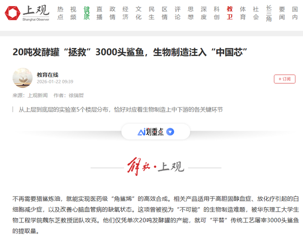 不再需要猎鲨炼油,就能实现医药级“角鲨烯”的高效合成。相关产品适用于高胆固醇血症、放化疗引起的白细胞减少症,以及改善心脑血管病的缺氧状态。这项曾被视为“不可能”的生物制造难题,被华东理工大学生物工程学院魏东芝教授团队攻克。他们仅凭单次20吨发酵罐的产能,就可“平替”传统工艺屠宰3000头鲨鱼的提取量。