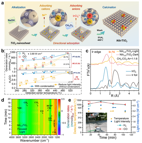基于上述背景,团队成员运用定向吸附策略(图a),在TiO2载体上构建了具有原子配位的双金属NiIr纳米团簇。该催化剂展现出10841 mmol gcat-1 h-1的合成气生成速率,光热燃料转化效率高达25.0%,转化频率达23 s-1。研究表明,光电效应在该体系中起到主导作用(图b),对合成气生成速率的贡献为57.5%,对产物比例平衡的贡献为91.7%。原位谱学研究(图c-d)表明,NiIr双金属团簇在光诱导下产生的界面电荷振荡可触发动态结构重构,形成由氧化镍键合稳定的TiO2负载的NiIr纳米岛合金结构。该结构演变源于光激发下TiO2-Ni-Ir界面间的强电子转移过程。这种空间与电子协同的构型在光驱动DRM反应中加速了H-H偶联,并促进了CHxO*中间体生成,该反应路径有效抑制了碳沉积。此外,该催化体系在室外聚焦的太阳光下(图e)实现了与实验室条件相当的合成气生成速率,这为发展自然太阳光催化温室气体转化提供了技术支撑。