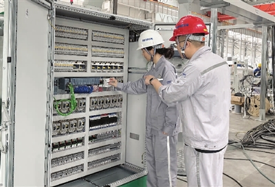 华东理工大学博士生李冰玉(左)与中化学装备工程师现场调试设备。■受访对象供图