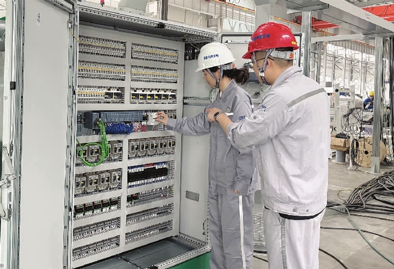 华东理工大学博士生李冰玉(左)与中化学装备工程师现场调试设备。■受访对象供图