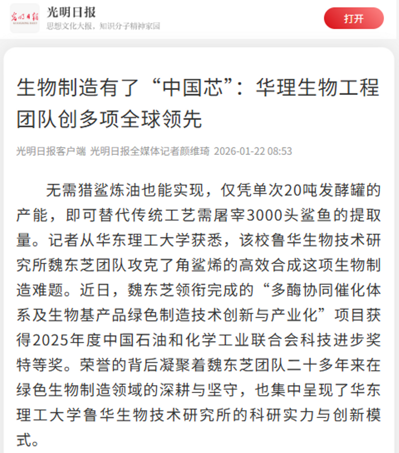 无需猎鲨炼油也能实现,仅凭单次20吨发酵罐的产能,即可替代传统工艺需屠宰3000头鲨鱼的提取量。记者从华东理工大学获悉,该校鲁华生物技术研究所魏东芝团队攻克了角鲨烯的高效合成这项生物制造难题。近日,魏东芝领衔完成的“多酶协同催化体系及生物基产品绿色制造技术创新与产业化”项目获得2025年度中国石油和化学工业联合会科技进步奖特等奖。荣誉的背后凝聚着魏东芝团队二十多年来在绿色生物制造领域的深耕与坚守,也集中呈现了华东理工大学鲁华生物技术研究所的科研实力与创新模式。