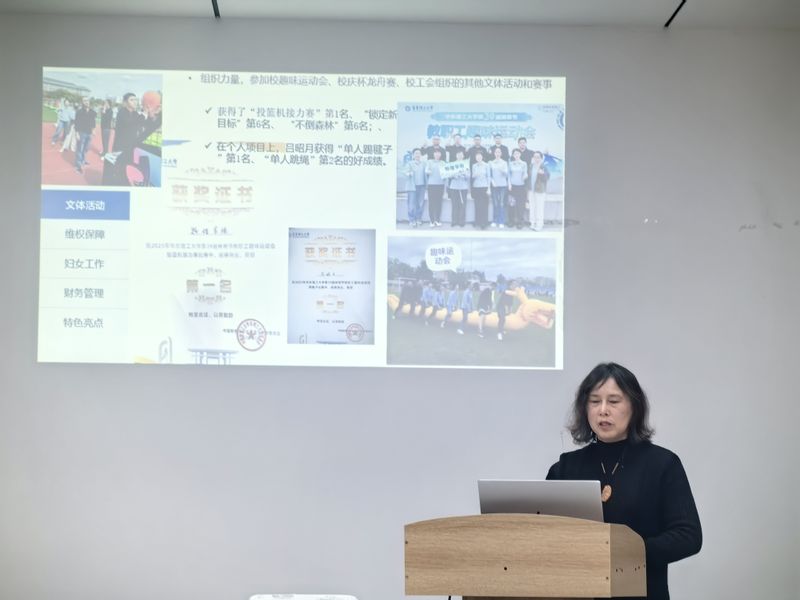 图片说明:谢湘华作学院工会工作报告和财务报告