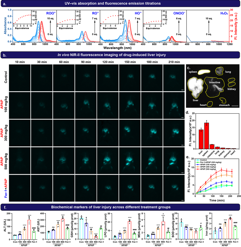研究团队系统验证了LHA探针的优异性能:(一)高灵敏度与特异性:LHA系列探针能特异性响应与脂质过氧化相关的多种高活性氧自由基(ROO·,RO·,HO·等)而对H₂O₂、ClO⁻等无明显反应。(二)良好的光稳定性与生物相容性:探针本身无背景荧光,且对光照稳定,适合长时间活细胞成像。(三)卓越的早期检测能力:在HT22细胞的氧糖剥夺/再灌注模型中,LHA585在再灌注初期即产生荧光信号,比现行金标准探针C11-BODIPY 581/591提前约8小时检测到铁死亡的发生。(四)活体成像可行性:进一步开发的近红外二区探针LHA930,成功应用于对乙酰氨基酚(APAP)诱导的小鼠药物性肝损伤模型,通过尾静脉注射后,在肝脏部位观察到显著的荧光增强,且该信号可被铁死亡抑制剂Fer-1有效抑制,证实了铁死亡在此肝损伤过程中的关键作用。