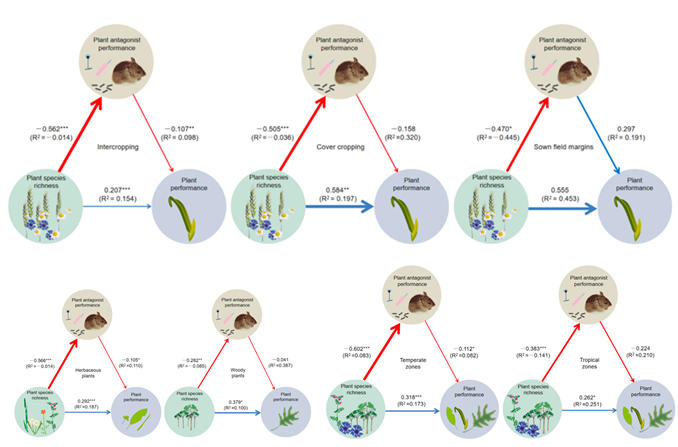 该研究分析了来自全球609项实验、5712组数据,覆盖农田、草原、森林三大生态系统,横跨热带与温带,在全球尺度上证实:植物多样性种植不仅能直接促进植物增产,更能通过抑制植物病虫害间接提升作物产量,为发展高效生态农林业与草业提供了兼具科学创新性与实践可行性的全新路径。