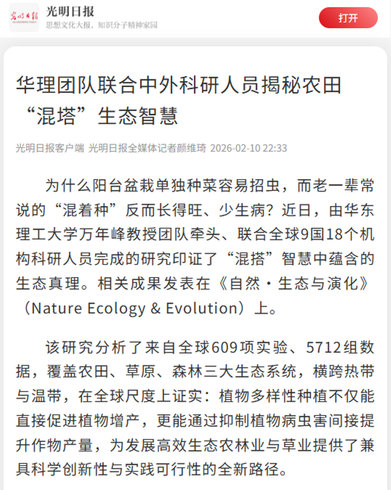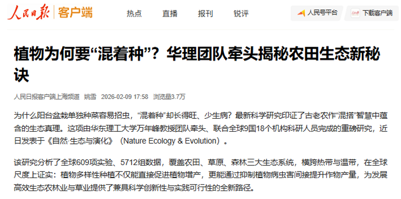 为什么阳台盆栽单独种菜容易招虫,“混着种”却长得旺、少生病?最新科学研究印证了古老农作“混搭”智慧中蕴含的生态真理。这项由华东理工大学万年峰教授团队牵头、联合全球9国18个机构科研人员完成的重磅研究,近日发表于《自然·生态与演化》(Nature Ecology & Evolution)。人民日报客户端、央视新闻客户端、光明日报客户端、中国日报客户端、中国教育报客户端、中国青年报客户端、解放·上观、中新网APP、中化新网、科学网APP、文汇·上观、新民·上观、青春上海、东方网、上海教育新闻网、新民周刊、上海科技报、第一教育、话匣子等近20家媒体进行了原发报道。本篇选取了部分报道予以转载。
