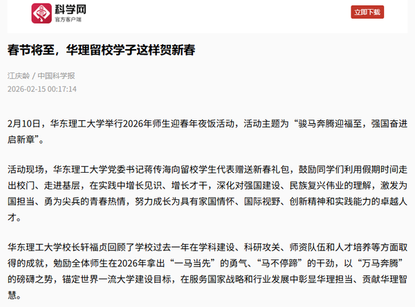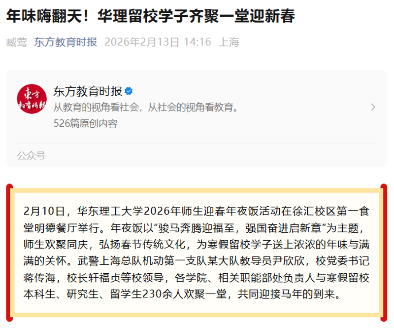 正值农历小年,2月10日,华东理工大学2026年师生迎春年夜饭活动在徐汇校区第一食堂明德餐厅举行。年夜饭以“骏马奔腾迎福至,强国奋进启新章”为主题,师生欢聚同庆,弘扬春节传统文化,为寒假留校学子送上浓浓的年味与满满的关怀。光明日报客户端、中国新闻网、科学网APP、解放·上观、《青年报》、文汇·上观、东方网、青春上海、新民周刊、上海科技报、上海教育新闻网、东方教育时报、第一教育、话匣子等10余家媒体进行了原发报道。本篇选取了部分报道予以转载。