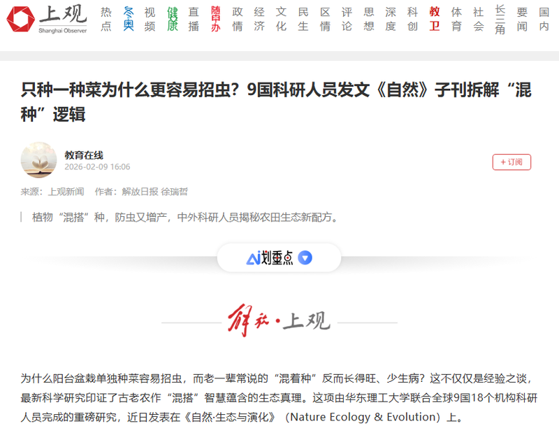 【解放·上观】只种一种菜为什么更容易招虫?9国科研人员发文《自然》子刊拆解“混种”逻辑