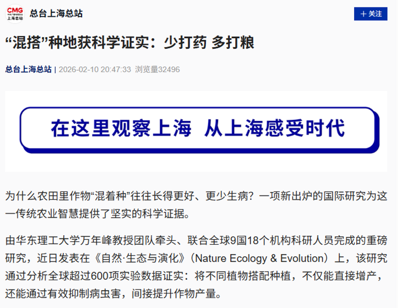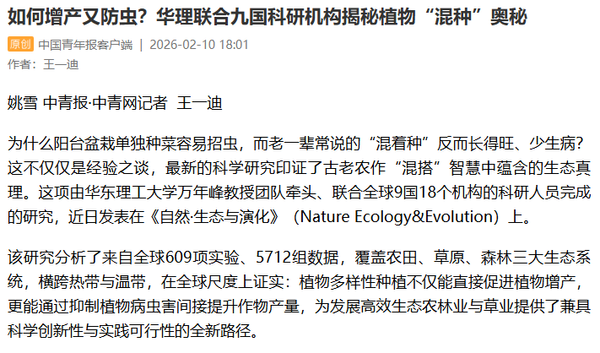 为什么阳台盆栽单独种菜容易招虫,“混着种”却长得旺、少生病?最新科学研究印证了古老农作“混搭”智慧中蕴含的生态真理。这项由华东理工大学万年峰教授团队牵头、联合全球9国18个机构科研人员完成的重磅研究,近日发表于《自然·生态与演化》(Nature Ecology & Evolution)。人民日报客户端、央视新闻客户端、光明日报客户端、中国日报客户端、中国教育报客户端、中国青年报客户端、解放·上观、中新网APP、中化新网、科学网APP、文汇·上观、新民·上观、青春上海、东方网、上海教育新闻网、新民周刊、上海科技报、第一教育、话匣子等近20家媒体进行了原发报道。本篇选取了部分报道予以转载。