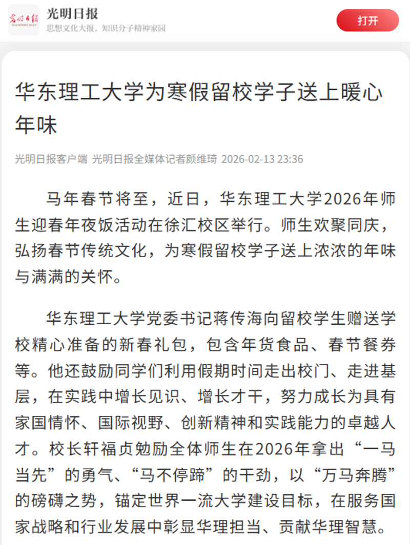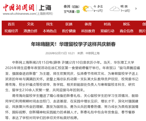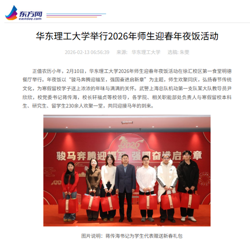 正值农历小年,2月10日,华东理工大学2026年师生迎春年夜饭活动在徐汇校区第一食堂明德餐厅举行。年夜饭以“骏马奔腾迎福至,强国奋进启新章”为主题,师生欢聚同庆,弘扬春节传统文化,为寒假留校学子送上浓浓的年味与满满的关怀。光明日报客户端、中国新闻网、科学网APP、解放·上观、《青年报》、文汇·上观、东方网、青春上海、新民周刊、上海科技报、上海教育新闻网、东方教育时报、第一教育、话匣子等10余家媒体进行了原发报道。本篇选取了部分报道予以转载。