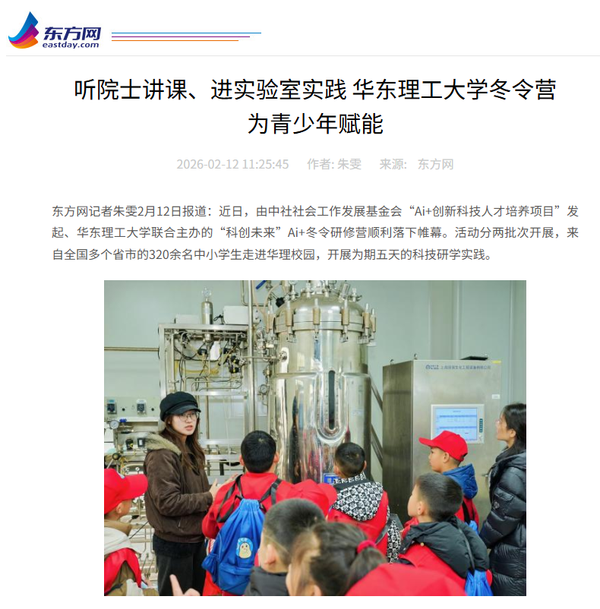 【东方网】听院士讲课、进实验室实践 华东理工大学冬令营为青少年赋能