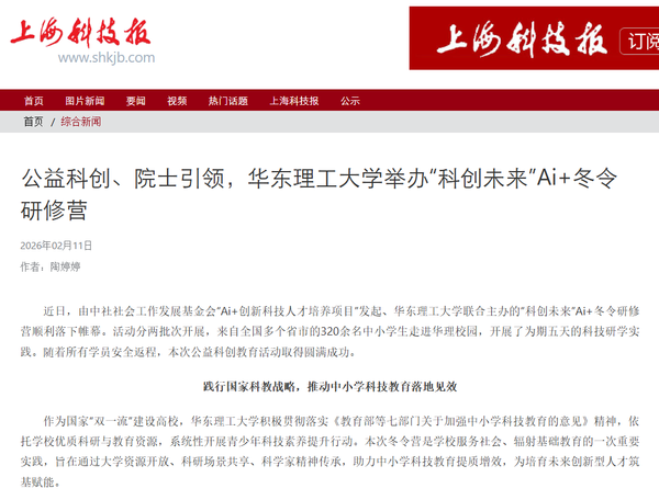 【上海科技报】公益科创、院士引领,华东理工大学举办“科创未来”Ai+冬令研修营