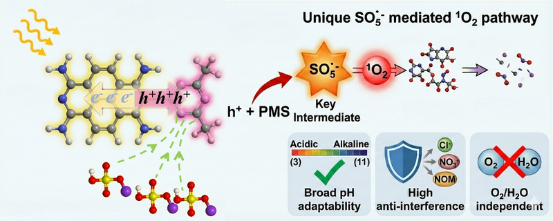 抗生素如左氧氟沙星(LVX)等在水体中的残留已成为全球性环境问题。基于过氧单硫酸盐(PMS)的高级氧化工艺虽能有效降解此类污染物,但传统自由基路径存在寿命短、易受水质干扰、氧化剂利用率低等局限。单线态氧(1O2)作为一种非自由基活性氧物种,具有环境适应性强、选择性高等优势,然而当前1O2的生成主要依赖超氧自由基的间接转化,不仅需要引入外源反应物,还伴随着能量损耗与副反应风险,导致反应效率较低。本研究首次在共价有机框架/过氧单硫酸盐(COF/PMS)体系中提出了“光生空穴直接氧化”机制。与传统的电子活化路径不同,该机制实现了催化剂结构单元的多功能集成:通过精确设计以三嗪环为核心的PI-COF催化剂,使其兼具光生空穴捕获中心与PMS特异性吸附位点的双重功能。三嗪环结构富集的光生空穴能够原位氧化吸附于其上的PMS分子,驱动其去质子化过程并直接生成SO₅⁻•。实验表明,该空穴主导的活化路径成功规避了传统路径中高能O-O键的直接断裂与自由基链式反应的介入,将反应路径精准导向SO₅⁻·自发生成1O2的非自由基途径,实现了高达99.5%的1O2生成选择性。为验证该技术的实际应用潜力,团队构建了以PI-COF为活性组分的连续流光反应器。在长达10小时的连续运行中,系统对LVX的降解率始终维持在90%以上,展现出优异的长期稳定性与抗干扰能力。理论计算与机理研究证实,该策略通过分子层面的精准调控,显著降低了界面反应能垒,实现了从“电子还原”到“空穴氧化”的路径转型,为复杂有机废水的高效处理提供了新的科学见解。