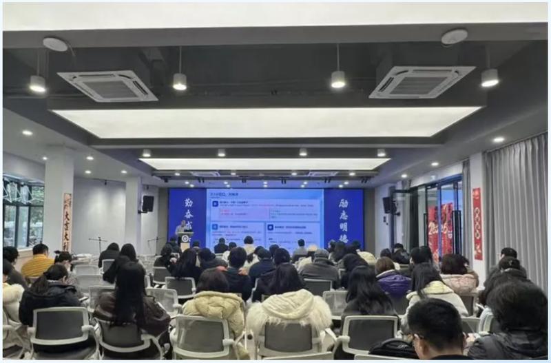 在分享交流环节,挂职教师周洁分享了挂职期间的实践经验与感悟,探讨了如何将外部资源与学院教学科研深度融合。随后,学院新进教职工入职仪式举行,于炜、傅蓉蓉、章彰和叶俊男等为新进教工佩戴了校徽。