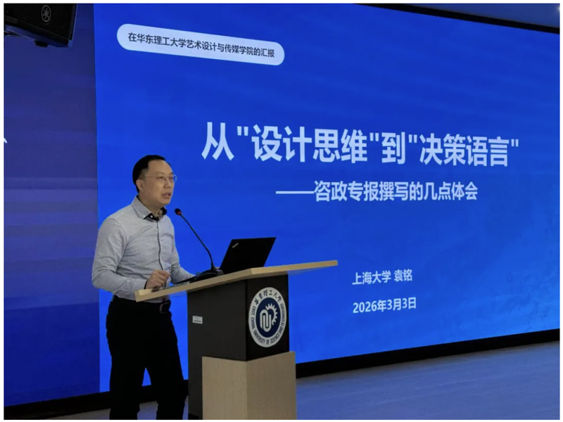 会议特邀上海大学微电子学院党委副书记、副院长袁铭作题为《从“设计思维”到“决策语言”——咨政专报撰写的几点体会》的专题报告。袁铭结合华理艺设学院在工业设计、数字媒体艺术等国家一流专业领域的学科优势,深刻阐述了设计在治国理政、社会治理及城市更新中的工具作用。他指出,新时代的决策需融入“审美”与“以人为本”的视角,鼓励教师们将专业研究转化为高质量的咨政建议,强调选题要“蹭热点、抓痛点、找盲点”,切口要小、调研要深、视角要特,实现“大处着眼,小处着手”,让设计驱动产业创新并服务城市高质量发展。