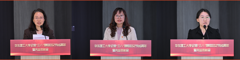 代表发言环节,上海市三八红旗手、材料科学与工程学院屈雪以“追光而行,在华理沃土绽放科创之花”为题,深情回顾了自己从基础化学到生物材料的跨界科研历程和成长感悟。校三八红旗集体代表、信息科学与工程学院学生工作办公室负责人许浩以“凝心聚力育英才,巾帼奋进绽芳华”为题,介绍了集体团结协作、服务学生的感人事迹。校三八红旗手、机关财务处滕静以“在数字的海洋里,看见教育的星辰”为题,讲述了在平凡岗位上默默奉献、追求卓越的心路历程。3位代表分享的故事与感悟真挚动人,充分展现了我校女教职工爱岗敬业、锐意进取、温柔而坚定的巾帼风采。