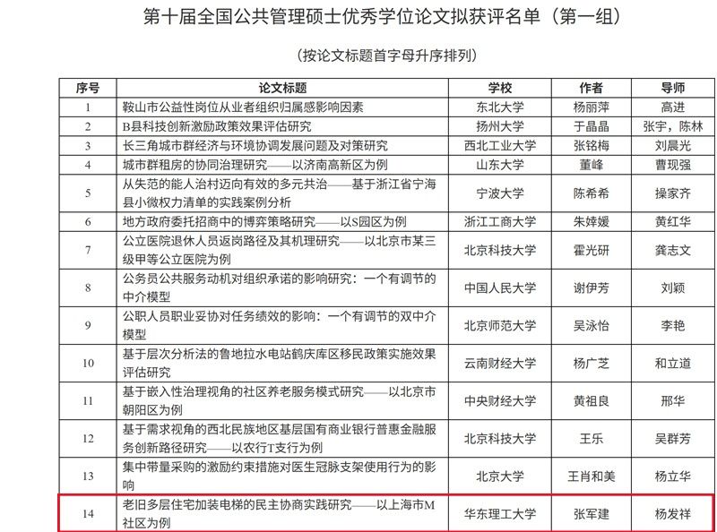 近日,第十届全国公共管理硕士优秀学位论文遴选结果正式公布。我校社会与公共管理学院MPA学生张军建的学位论文成功入选,这是我校MPA教育在该项全国性评选中的首次入选成果。论文指导教师为杨发祥教授。