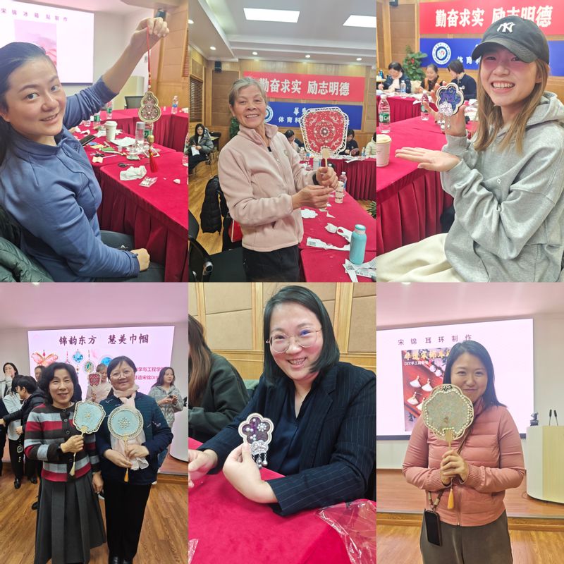 锦绣裁春传古艺,巾帼筑梦展芳华。3月10日,为庆祝第116个“三八”国际劳动妇女节,致敬每一位在岗位上绽放光彩的女教工,体育学院工会在徐汇校区体育馆104会议室组织开展了一场别开生面的非遗宋锦饰品DIY活动。活动围绕“锦韵东方·慧美巾帼”主题,以千年宋锦为媒,以春日雅韵为伴,让女教职工们在一画一剪、一粘一贴中邂逅传统美学、感受非遗魅力。