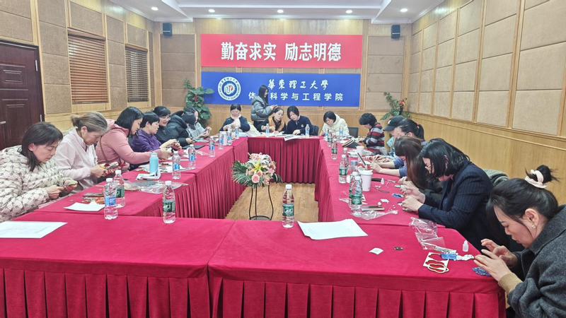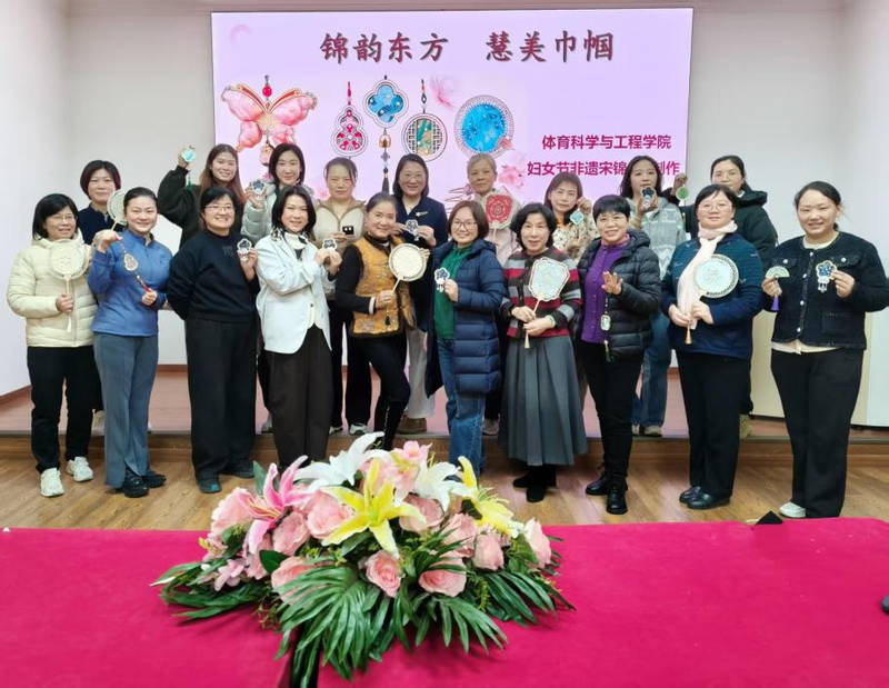 锦绣裁春传古艺,巾帼筑梦展芳华。3月10日,为庆祝第116个“三八”国际劳动妇女节,致敬每一位在岗位上绽放光彩的女教工,体育学院工会在徐汇校区体育馆104会议室组织开展了一场别开生面的非遗宋锦饰品DIY活动。活动围绕“锦韵东方·慧美巾帼”主题,以千年宋锦为媒,以春日雅韵为伴,让女教职工们在一画一剪、一粘一贴中邂逅传统美学、感受非遗魅力。