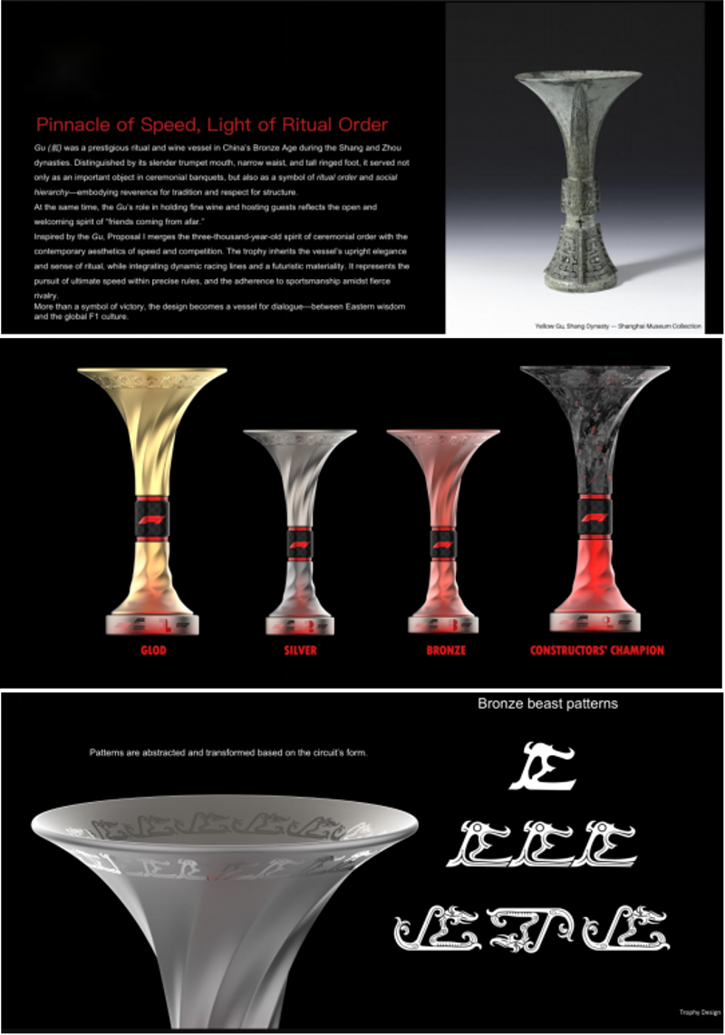 本次F1中国大奖赛奖杯设计,正是设计服务城市、融入城市发展的典范。李卓、谢臻、刘淼三位教师组成的设计团队从中国青铜时代礼器“觚”中汲取灵感,保留其喇叭形口、细腰和高圈足等经典轮廓,象征礼制秩序与待客之道。同时,将F1赛车的空气动力学线条融入奖杯造型,让静态的奖杯传递出速度与力量,完美呼应了规划中“打造国际一流的赛事之都”“促进文旅商体展深度融合”的发展目标,从设计到制作再到成为焦点,是设计也是文化,该设计得到了一致的认可和好评。