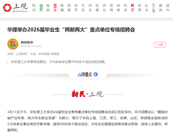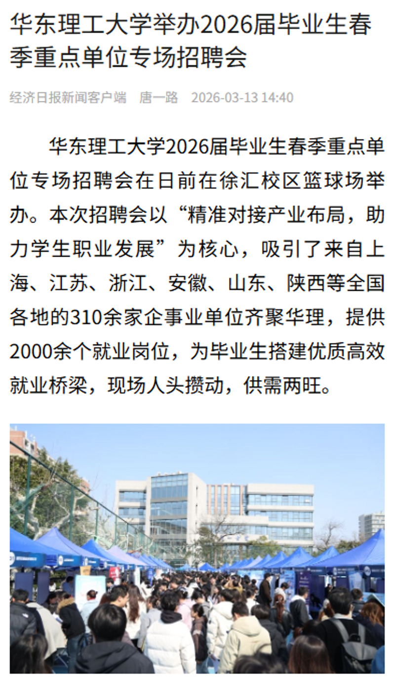 3月11日,华东理工大学2026届毕业生春季重点单位专场招聘会举办。本次招聘会以“精准对接产业布局,助力学生职业发展”为核心,吸引了来自全国各地的310余家企事业单位,提供2000余个就业岗位,为毕业生搭建优质高效就业桥梁。经济日报客户端、中国新闻网、科学网APP、新民·上观、劳动观察、东方网、上海教育新闻网、上海科技报、第一教育、看看新闻Knews、东方财经等多家媒体进行了原发报道。本篇选取了部分报道予以转载。