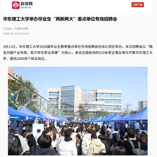 3月11日,华东理工大学2026届毕业生春季重点单位专场招聘会举办。本次招聘会以“精准对接产业布局,助力学生职业发展”为核心,吸引了来自全国各地的310余家企事业单位,提供2000余个就业岗位,为毕业生搭建优质高效就业桥梁。经济日报客户端、中国新闻网、科学网APP、新民·上观、劳动观察、东方网、上海教育新闻网、上海科技报、第一教育、看看新闻Knews、东方财经等多家媒体进行了原发报道。本篇选取了部分报道予以转载。
