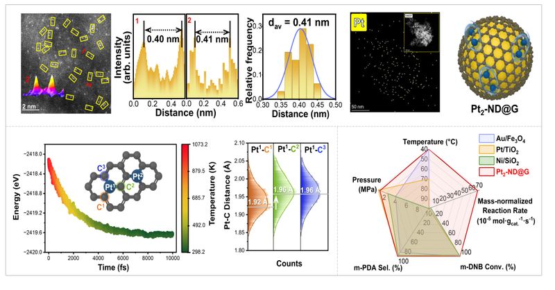 硝基化合物加氢是高值化学品制造领域的核心过程,其关键在于实现多官能团分子中硝基的选择性活化,以定向合成苯二胺等重要中间体。尽管负载型铂族金属催化剂因优化的d带结构具有优异加氢活性,但在硝基化合物多步还原过程中,硝基逐级还原产生的电子屏蔽与空间位阻会抑制中间体的连续转化,难以兼顾反应活性与目标产物选择性。先前研究表明,通过调控活性位点至原子级分散状态,可显著提升金属利用率,但孤立位点对氢气的解离能力不足往往成为制约催化性能的关键瓶颈(AIChE J. 2024, 70, e18278; ACS Catal. 2025, 15(14), 12365)。为此,研究团队基于双原子位点协同催化策略,在纳米金刚石-石墨烯载体上构筑了具有非键合特征的高密度缺电子Pt2位点,实现了硝基化合物吸附与氢气活化的位点解耦,显著提升了硝基化合物的选择性加氢性能。
