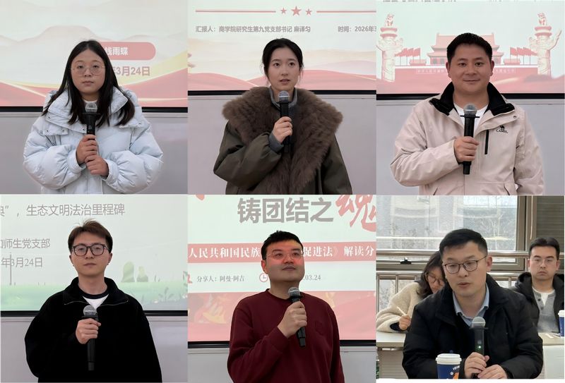 本次联学活动由习近平新时代中国特色社会主义思想研究会指导教师、党委研工部戎思淼主持。研讨会上,习近平新时代中国特色社会主义思想研究会宣讲团成员、马克思主义学院2025级硕士生党支部副书记钱雨蝶介绍了2026年全国两会的基本情况,并结合“大思政课”背景下开展形势政策教育的实际需求,强调当前组织广大研究生学习践行两会精神的重要意义,介绍了围绕两会精神开展理论宣讲的创新方法。商学院研究生第九党支部书记麻译匀和宣讲团成员、社会学院2023级博士生佘国梁分别从产业经济学和社会发展理论两个不同角度,介绍了《中华人民共和国国民经济和社会发展第十五个五年规划纲要》中关于“十五五”时期我国在产业经济发展和乡村全面振兴等领域的宏伟蓝图。资环学院碳中和师生党支部副书记袁聪介绍了最新颁布的中国第二部以“法典”命名的法律——生态环境法典的有关情况。化工学院的研究生辅导员阿曼·阿吉老师为同学们解读了《中华人民共和国民族团结进步促进法》对铸牢中华民族共同体意识、助力民族复兴的重要性。