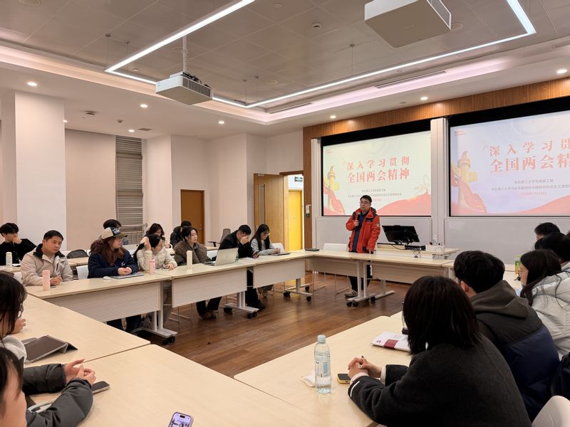本次联学活动由习近平新时代中国特色社会主义思想研究会指导教师、党委研工部戎思淼主持。研讨会上,习近平新时代中国特色社会主义思想研究会宣讲团成员、马克思主义学院2025级硕士生党支部副书记钱雨蝶介绍了2026年全国两会的基本情况,并结合“大思政课”背景下开展形势政策教育的实际需求,强调当前组织广大研究生学习践行两会精神的重要意义,介绍了围绕两会精神开展理论宣讲的创新方法。商学院研究生第九党支部书记麻译匀和宣讲团成员、社会学院2023级博士生佘国梁分别从产业经济学和社会发展理论两个不同角度,介绍了《中华人民共和国国民经济和社会发展第十五个五年规划纲要》中关于“十五五”时期我国在产业经济发展和乡村全面振兴等领域的宏伟蓝图。资环学院碳中和师生党支部副书记袁聪介绍了最新颁布的中国第二部以“法典”命名的法律——生态环境法典的有关情况。化工学院的研究生辅导员阿曼·阿吉老师为同学们解读了《中华人民共和国民族团结进步促进法》对铸牢中华民族共同体意识、助力民族复兴的重要性。