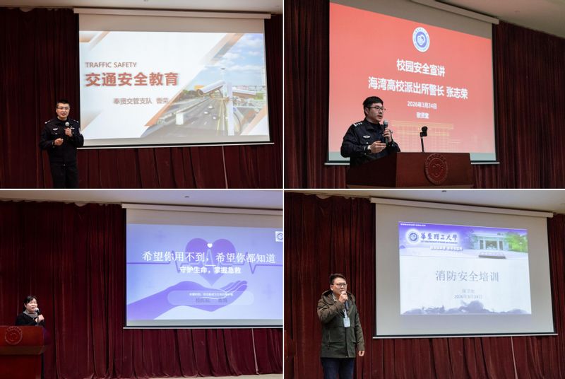 奉贤交管支队二大队指导员曹荣结合高校周边交通环境和典型案例,深入讲解交通法规与风险防范要点,引导同学们养成文明出行的良好习惯。海湾高校派出所警长张志荣聚焦校园安全,从防范电信网络诈骗、防盗防窃等方面剖析常见风险,帮助同学们增强防范意识。校保卫处消防管理科副科长骆海锋系统讲解火灾预防、初期扑救和逃生自救等关键知识,提醒同学们时刻绷紧消防安全这根弦。校医院副院长鹿博通过专业讲解与现场演示,向同学们普及心肺复苏、海姆立克急救法等实用急救技能,强调在“黄金时间”内科学施救的重要性。