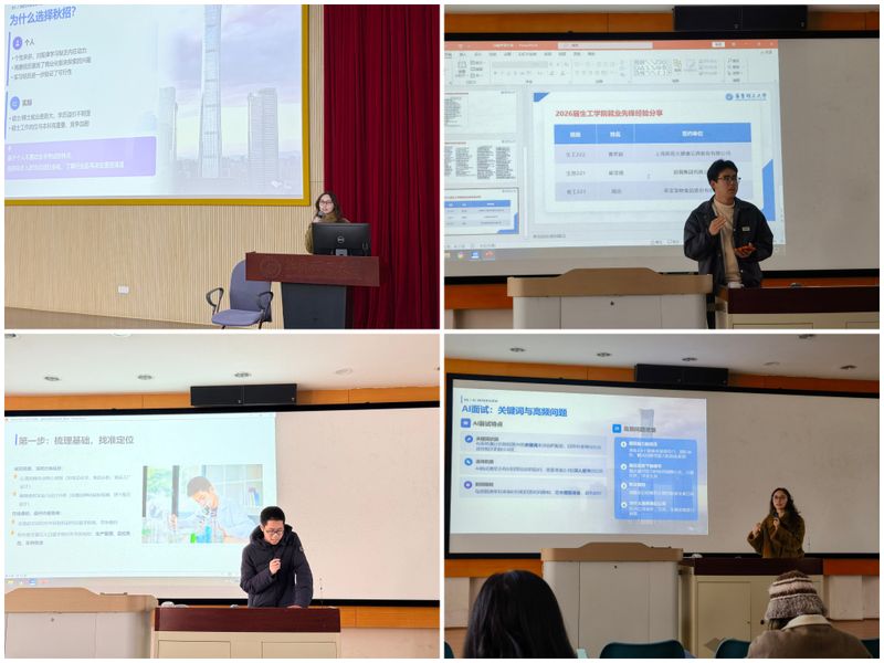 依托“朋辈引路·就业先锋分享”赋能计划,学院发挥优秀学子示范作用,邀请求职达人、就业先锋分享经验。在年级大会上,曹梦颖、崔泽斌、周由等同学围绕简历优化、面试技巧、职业定位与秋招全流程等内容,分享实战心得,将可复制的求职方法传递给同学,以榜样力量带动学生提升求职竞争力。