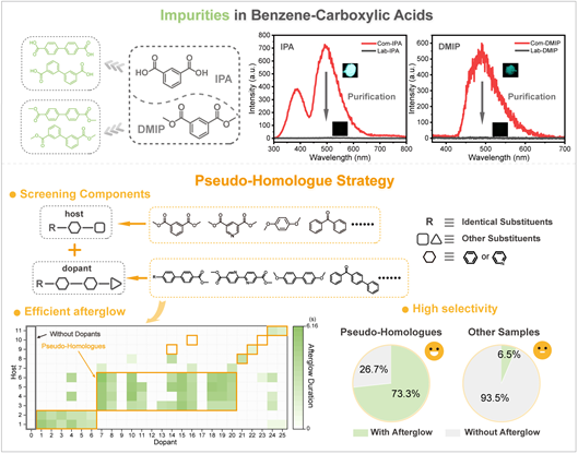 如图所示,确认间苯二甲酸及间苯二甲酸二甲酯中的杂质为联苯羧酸及羧酸酯。基于此开发的“类同系物策略”可高效构建余辉材料,符合该策略筛选的材料中具有余辉的比例(73.3%)远高于其他材料(6.5%)。