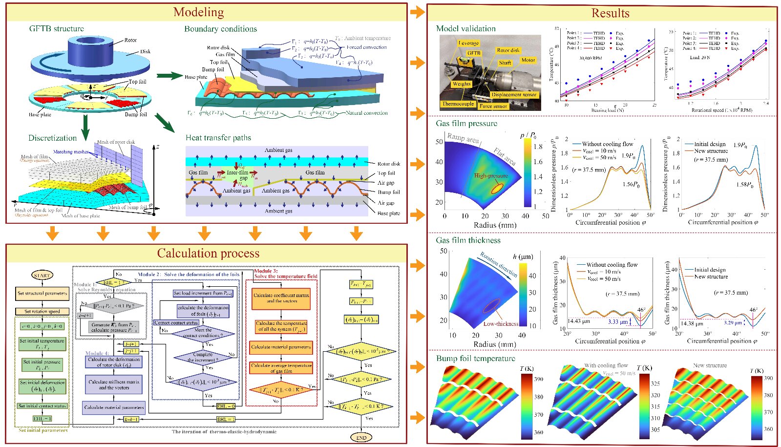 研究团队通过引入接触热阻和粘滞-滑移摩擦理论,建立了一个能够同时考虑结构热变形和摩擦接触的计算模型,能够协同计算波箔的力学变形和热量导过程,在保证计算精度的前提下提高了计算效率,并通过实验验证了模型的可靠性。