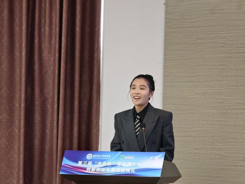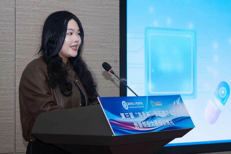 蔡畅在致辞中感谢商学院对此次“东岳杯”比赛的大力支持,对获奖学生表示衷心祝贺。她表示,本次颁奖典礼不仅是为了表彰那些在赛场上脱颖而出的优秀项目,更是为了致敬每一位敢于追梦、勇于创新的学生们。她表示本届大赛聚焦人工智能驱动原料药全价值链升级,精准锚定科技前沿与产业刚需,既紧跟人工智能发展的时代浪潮,也紧扣原料药行业转型升级的现实痛点,兼具前瞻性、实用性与落地性。