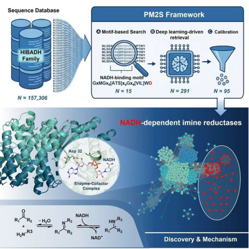 为突破这一局限,研究团队立足酶的辅酶结合保守基序,开发了PM2S (Protein Motif to Search)酶挖掘策略。该策略整合了基序搜索、深度学习驱动的迭代检索与结果校准三大模块,成功从15万条基因序列中筛选获得95个候选的天然NADH依赖型亚胺还原酶。实验结果表明,这些候选酶偏好以NADH为辅因子,催化亚胺还原及还原胺化反应,展现出极为宽泛的底物谱,并已用于西那卡塞等药物关键中间体的合成。