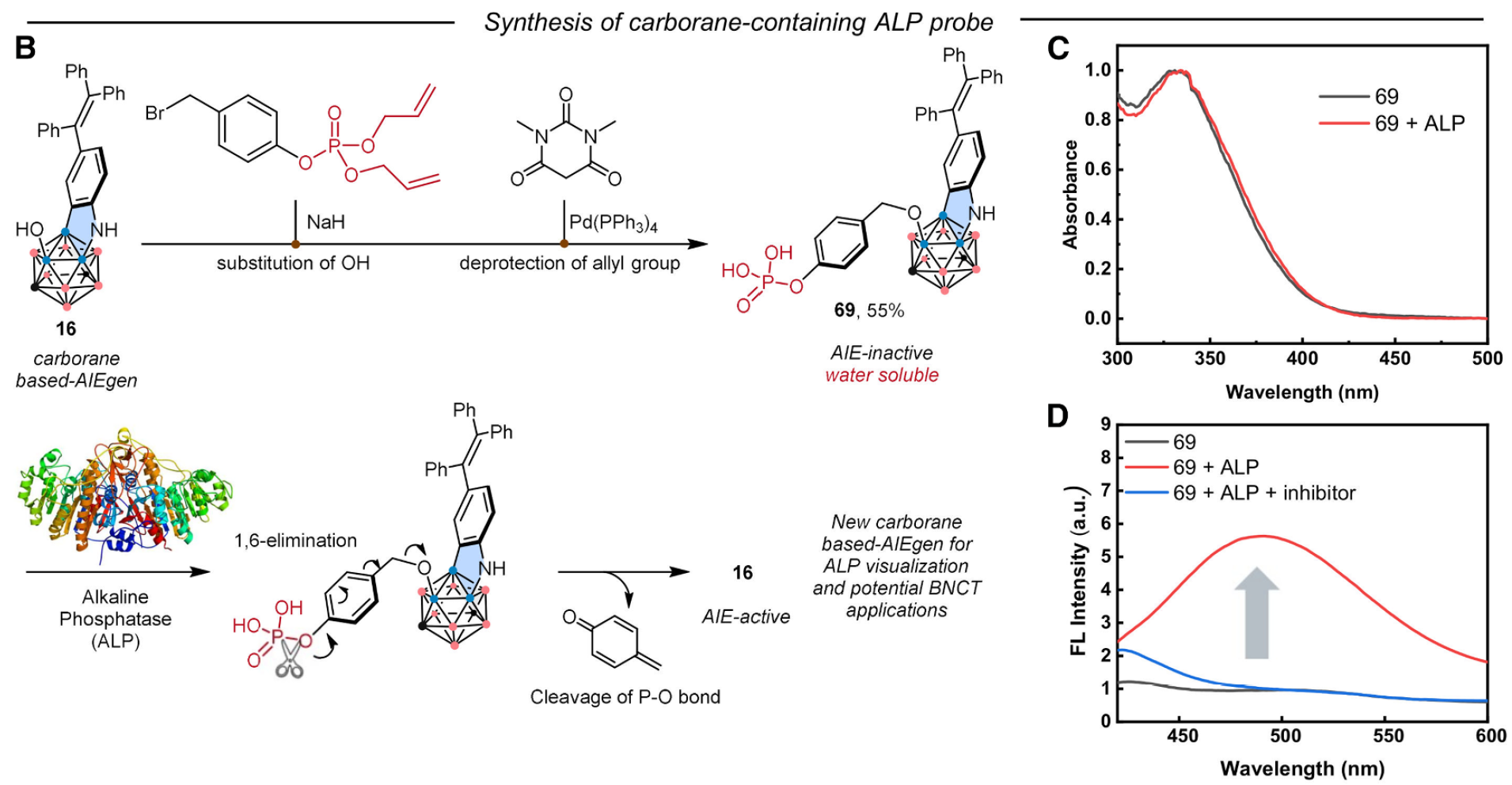 华东理工大学副教授慕欣团队与合作者,提出基于“羟基导向”的碳硼烷邻位三官能化策略,并成功构建了含碳硼烷结构的碱性磷酸酶(ALP)荧光探针,丰富了三维芳香性硼簇类化合物的合成方法学,也为硼中子俘获疗法药物和三维生物探针的开发提供了全新平台。相关研究成果近日发表于《化学》。